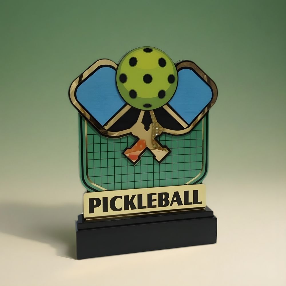 The Pickleball Championship Award Trophy is a premium indoor sports award crafted to celebrate agility, coordination, and competitive excellence in the fast-growing sport of pickleball. Designed using high-quality acrylic with a strong MDF base, this trophy features a dynamic pickleball paddle and ball design highlighted with modern colour accents and metallic detailing. It represents speed, teamwork, and precision on the court.
